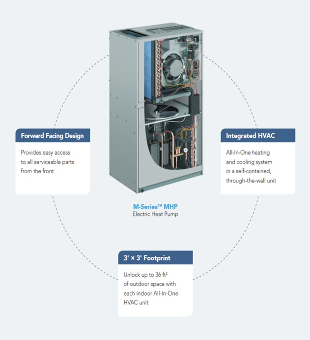 Individually controlled MagicPak®-heat pump model MHP, all-in-one system, provides heating, cooling and fresh air when residents select it. The Magic Pak system was specifically designed for multi-family dwellings and mixed-use properties 60 years ago simplifying every installation step, while saving time and money.